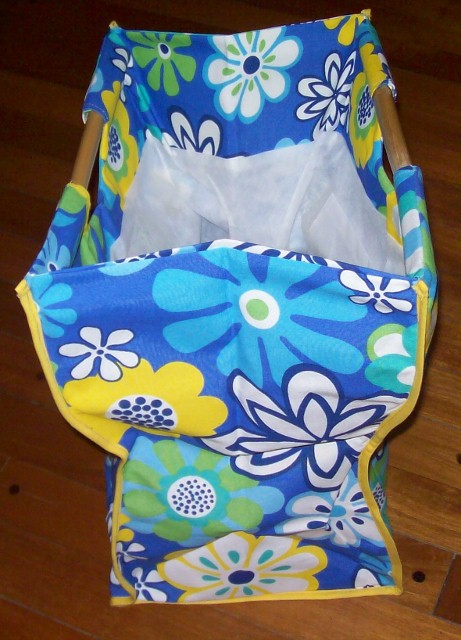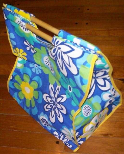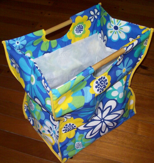 Bolso de loneta estampada con vivos forrada y manijas de caña. Medidas: Alto: 44 cm; Ancho 40 cm, lateral: 27 cm; base 28 x 40 cm. Fácilmente plegable.